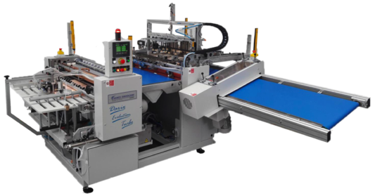 Case maker machine with automatic board feeding system suitable to run book covers or mono piece works in different sizes for Short/Medium runs.